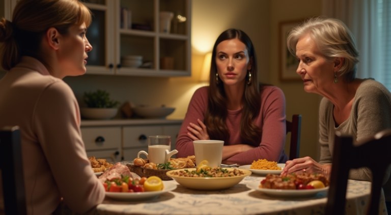 Вечер прошел удивительно тепло. Галина Николаевна накрыла богатый стол — пироги, салаты, даже утка с яблоками. Сестры наперебой рассказывали забавные истории из детства Валеры, дети играли тут же в гостиной, а свекровь все подкладывала и подкладывала угощения.
