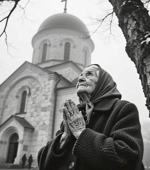 Последние лучи осеннего солнца робко золотили серые камни мостовой, а воздух был напоен прохладной свежестью и терпким ароматом увядающей листвы. У подножия белокаменного храма, на низкой скамейке, приютилась пожилая женщина в поношенном, но опрятном платке. Её руки, испещрённые прожилками лет, лежали на коленях, а взгляд, казалось, был устремлён куда-то далеко, вглубь собственных воспоминаний.