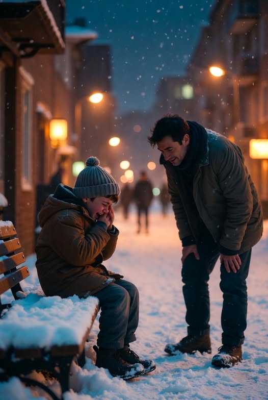 Вдруг он услышал детский плач. Посмотрел по сторонам и увидел на скамье мальчика в коричневом пальто и серой шапочке. Он громко плакал, размазывая слёзы по щекам.